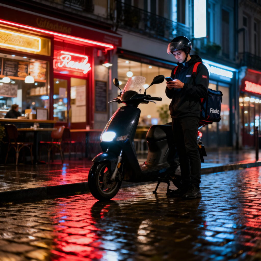 Le livreur vérifie son équipement, allume Uber Eats et Deliveroo, et se positionne immédiatement dans sa zone bien connue.
